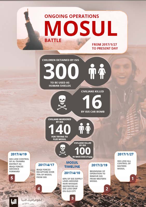 בנוסף, מפרסמת סוכנות הידיעות אינפוגרפים רבים ובשפות שונות, המסכמים בצורה ויזואלית את פעולות הטרור שמבצעים אנשיה[xvii] ובכלל זה את הקרבות על העיר מוסול[xviii].